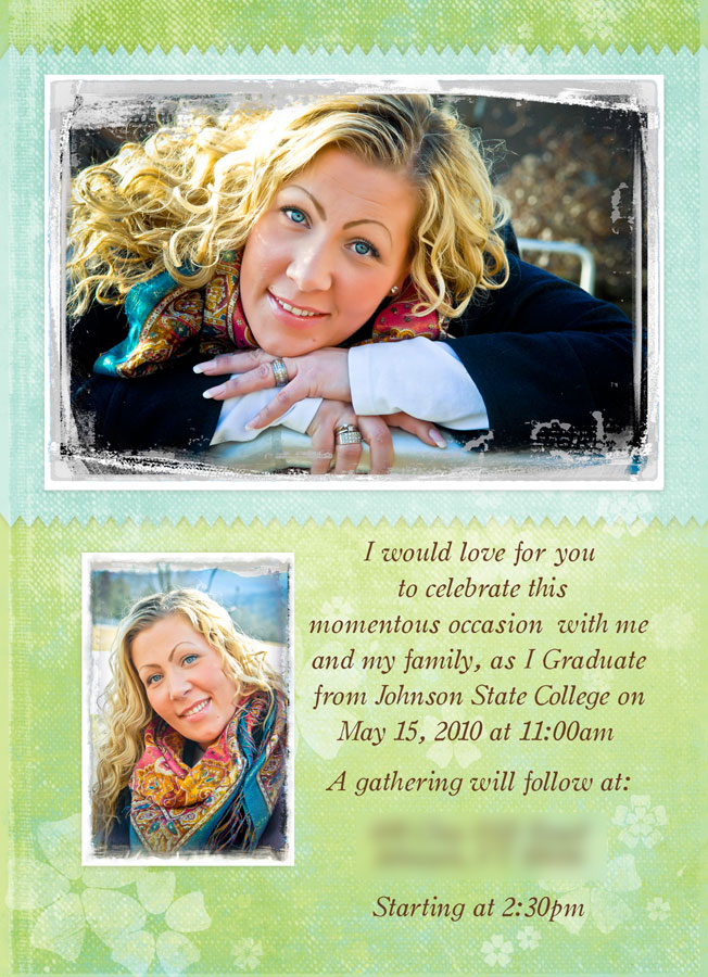 Lene – Graduation Portraits by Jon | Mar 15, 2010 | Photos | 0 comments Congratulations Lene, Class of 2010! Lene will be graduating this spring from Johnson State College with a BA in Hospitality Management. I took these portraits for her graduation announcements. Congrats!! Here are what the announcements look like: Submit a CommentYour email address will not be published. Required fields are marked *Comment * Name Email Website